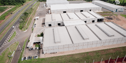 Galpões com cinco ou dez mil m², pé direito de doze metros, fechamento total em painéis de concreto, sistema anti-incêndio com sprinklers nível j4, iluminação em led, portas automáticas, telha termoacústica, mezanino para escritório e docas externas.